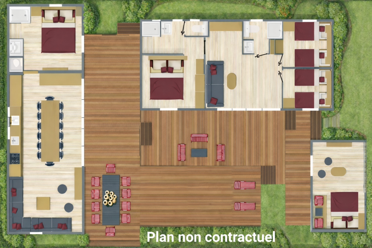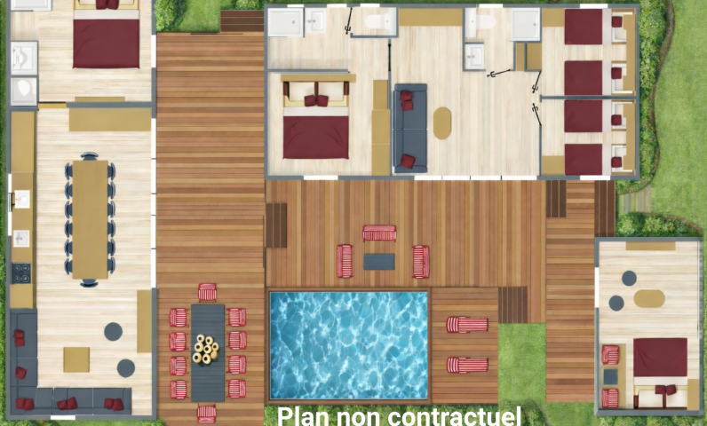 On aime l'espace, la convivialité et le confort que donne ce locatif arrivé au printemps 2026. Services inclus - Lits faits à l'arrivée - Serviettes de toilettes incluses - Ménage de fin de séjour Locatif composé de 3 éléments, avec des espaces cuisine et séjour communs : 5 chambres, 4 salles de douche et 4 WC. Équipements : - 3 terrasses dont 1 couverte, piscine privative, Plancha gaz, Mobilier de terrasse, Étendoir, Bains de soleil, Four, Four micro-ondes, Frigidaire, Congélateur, Lave-vaisselle, Plaque 4 feux gaz, Machine à café Nespresso Original, Cafetière, Bouilloire, Grille-pain, Canapé, TV, Douche, Sèche-serviettes, Sèche-cheveux