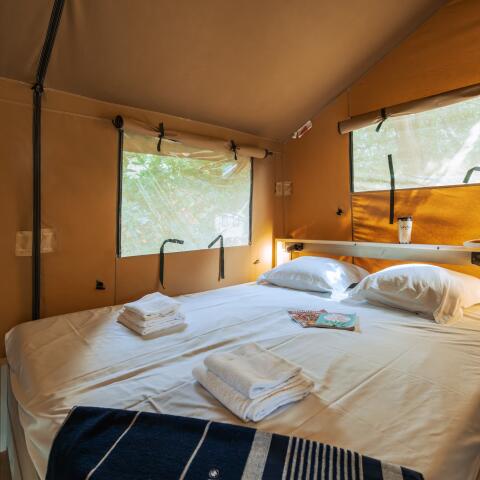 - 1 Sunêlia Luxe Lodge 3 chambres de 40m² : (une avec 1 lit double 160x200, une avec 2 lits simples superposés 70x90 et une autre avec 2 lits simples 80x190) et 2 salles de douche avec WC